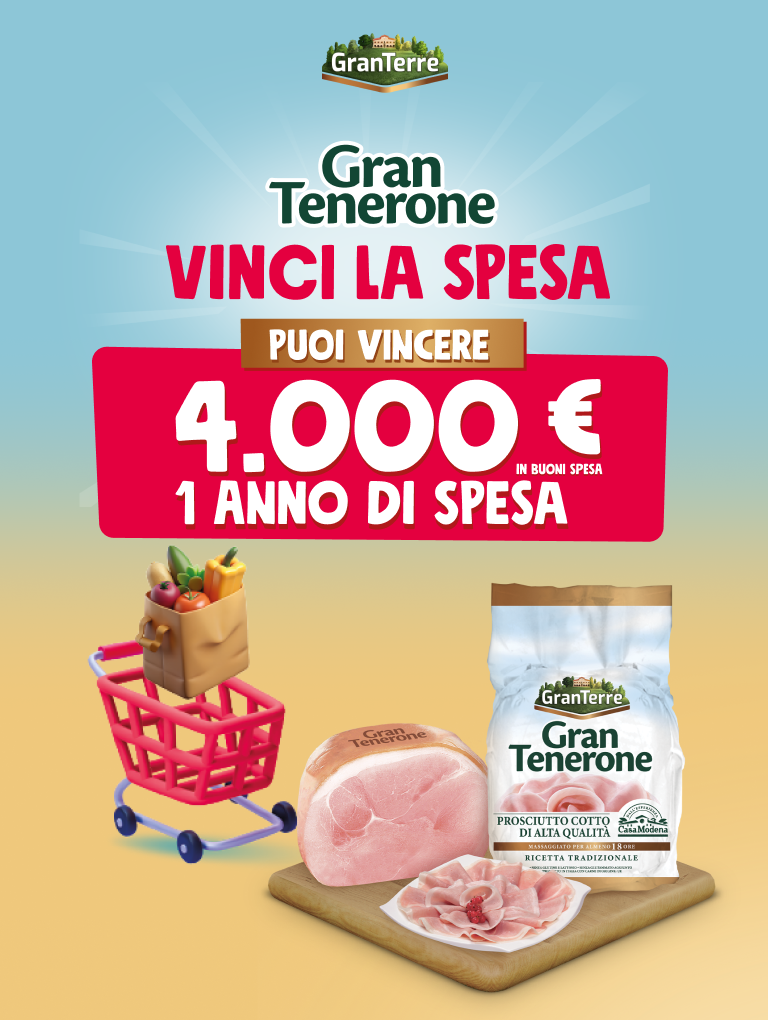 È tornato il Gran Concorsone! Dal 29 settembre al 30 novembre 2025, con la bontà del Prosciutto Cotto Alta Qualità Gran Tenerone, hai la possibilità di vincere un buono spesa da €4.000 valido per un anno. Ogni acquisto ti offre un’opportunità in più per partecipare all’estrazione finale, in cui verrà assegnato il premio tra tutte le partecipazioni valide.