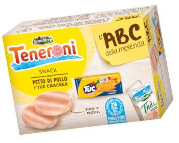 Tanto Gusto con il bilanciamento Giusto! Due snack con petto di pollo accompagnati da un dissetante tè alla pesca e gli iconici TUC Cracker.